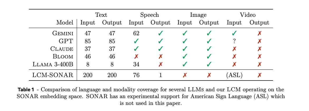 Gemini、GPT、Claude、Bloomなどと比較して、LCM-SONARが非常に多言語(テキストで200言語、音声で76言語)に対応していることがわかります。
