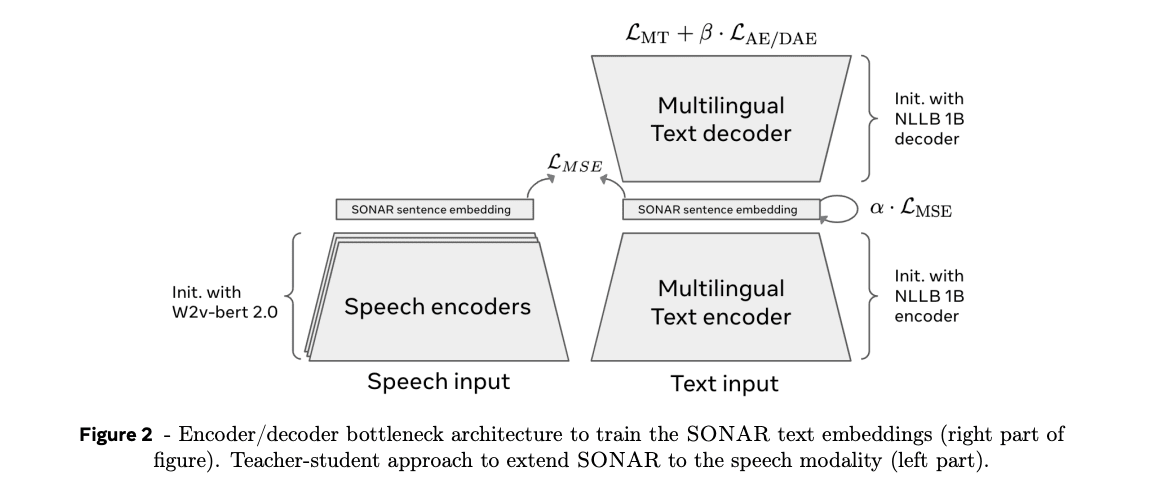 - 「Speech encoders」で音声を処理し、同じSONAR埋め込みに写像する。