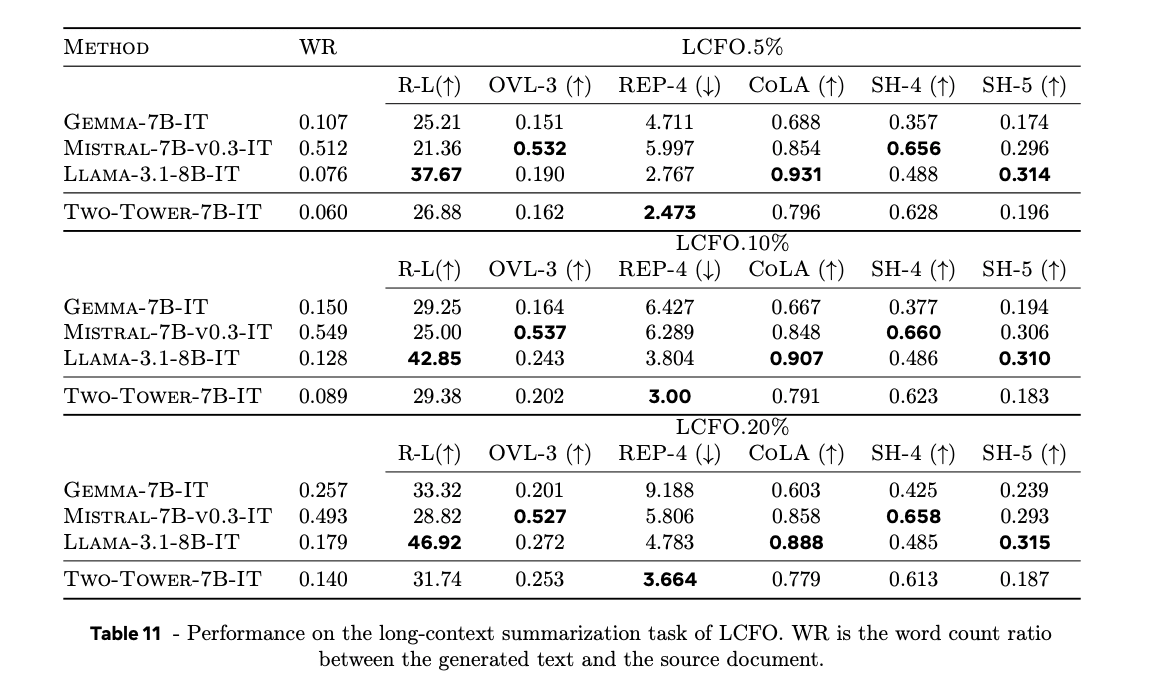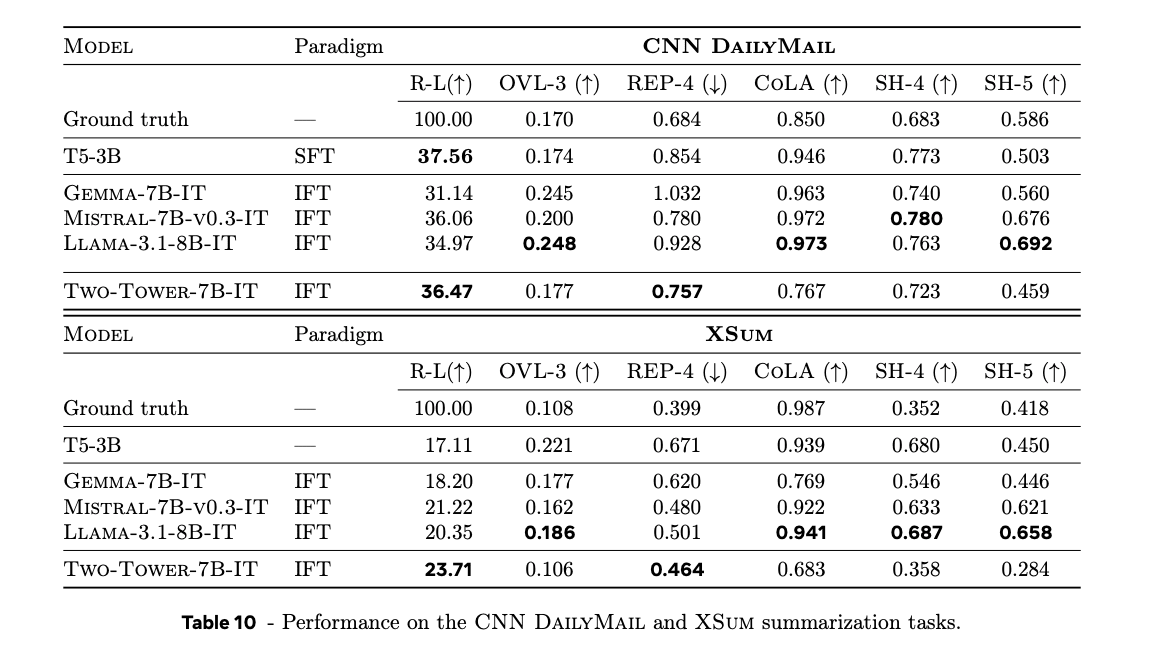 - Two-Tower-7B-ITは、より抽象的な要約を生成し、トークン重複が少ない一方で、流暢さがやや劣る場合があるという特徴が表れています。