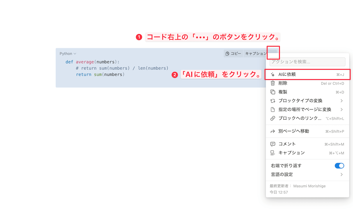 - コード右上の「•••」のボタンをクリックし、「AIに依頼」をクリックします。