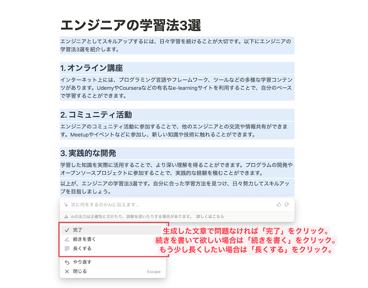 Notion AIにより、「土台となる文章」を書いてもらうことができます。