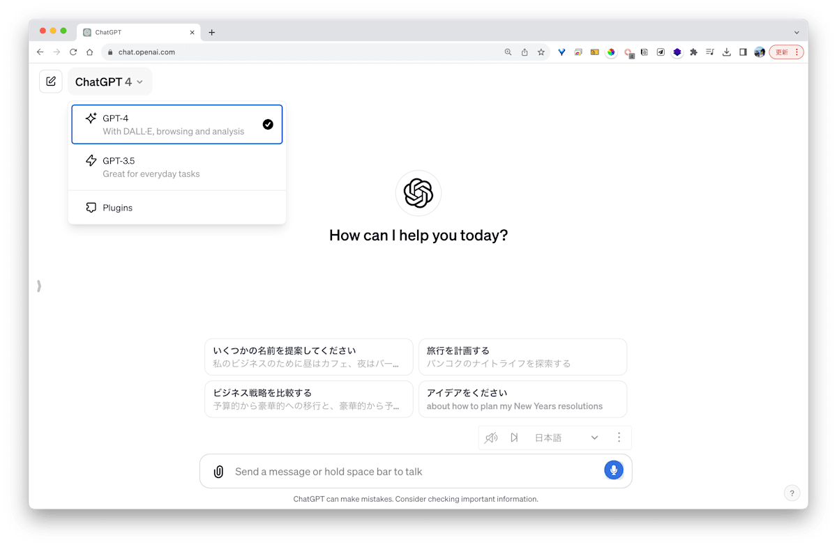 これまでは、画像生成機能(DALL·E 3)、ブラウジング機能、データ分析機能などを使う際は、各機能のタブへ変更する必要がありました。