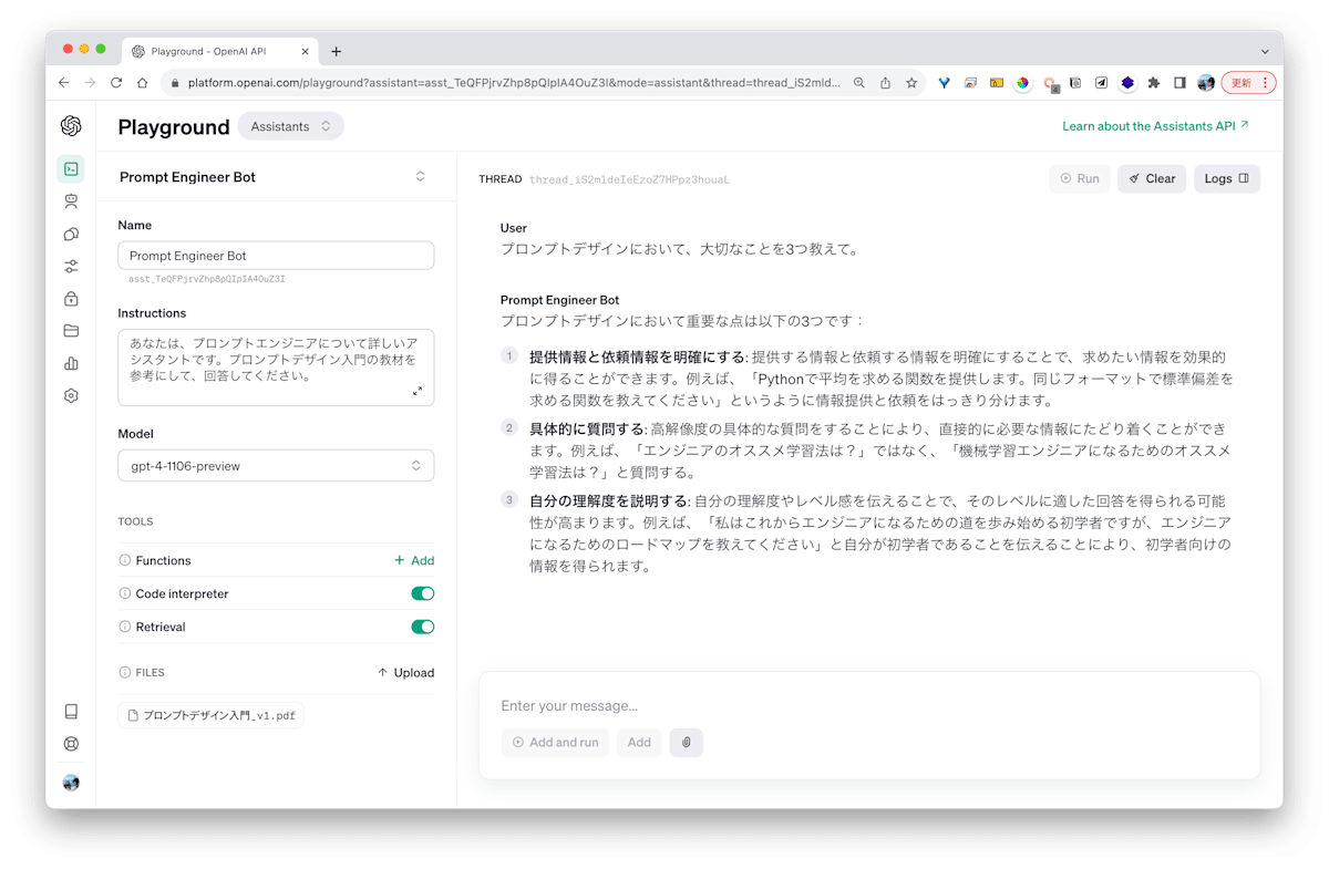 ここでは、Assistants APIをPlaygroundで動かした時の様子を紹介します。