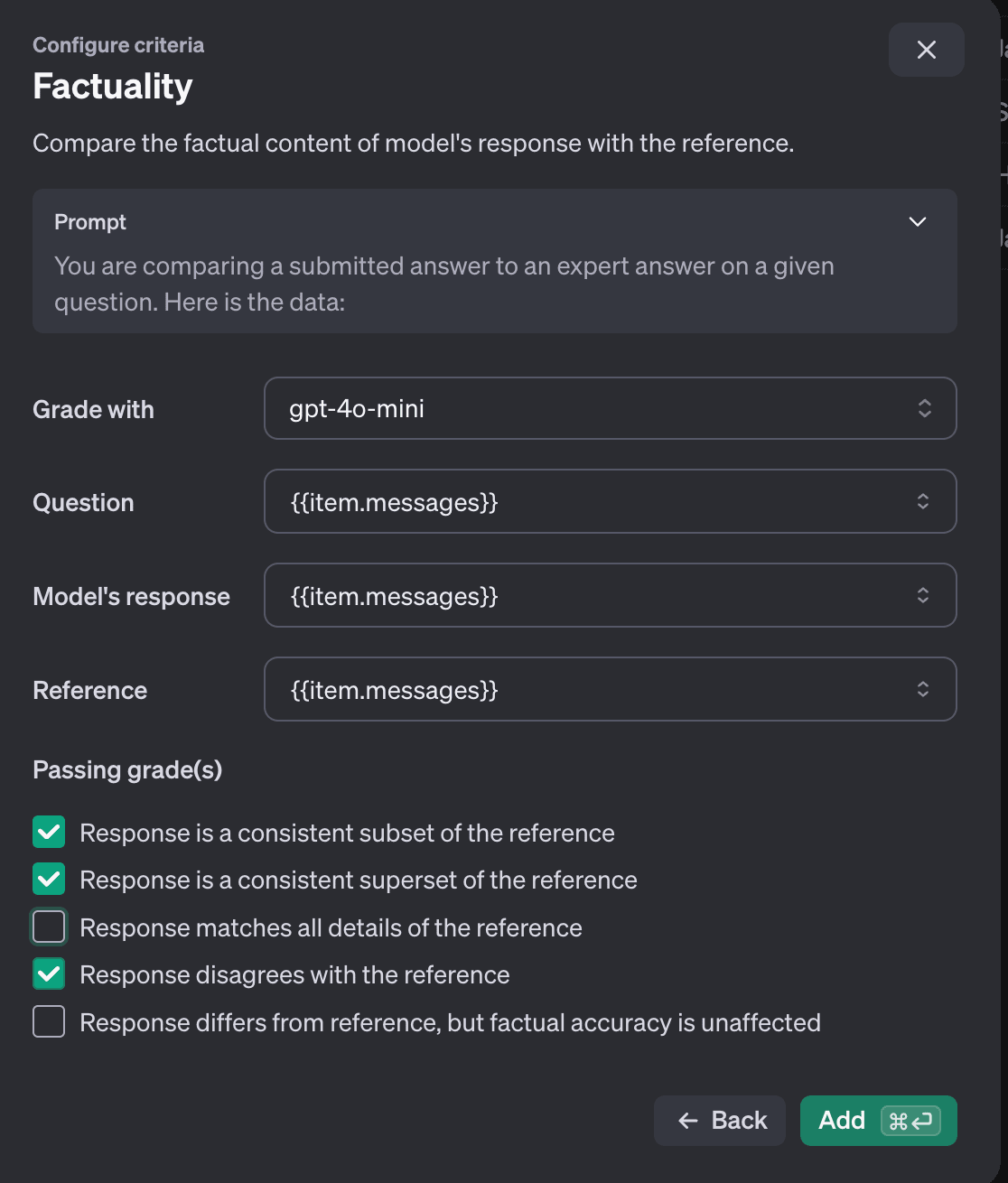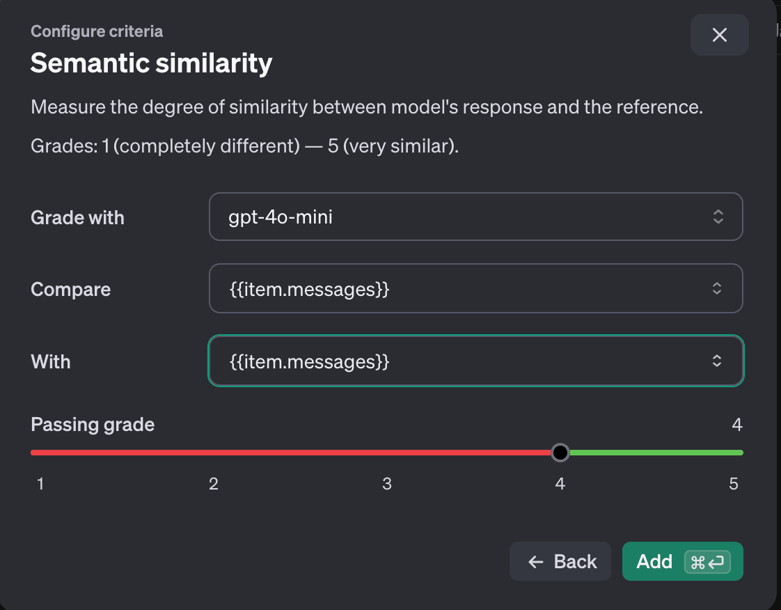 - 蒸留したいモデル(例:GPT-4o mini)のパフォーマンスを測定するための評価メトリクスを設定します。