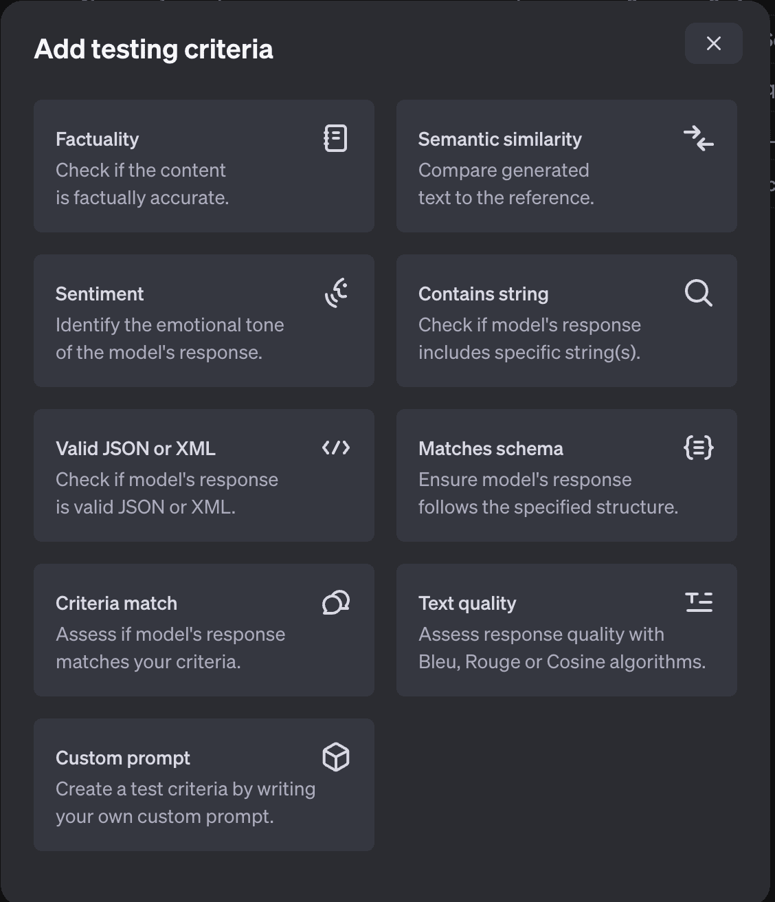 - Custom prompt:ユーザーが独自のテスト基準を作成できる柔軟な評価指標です。