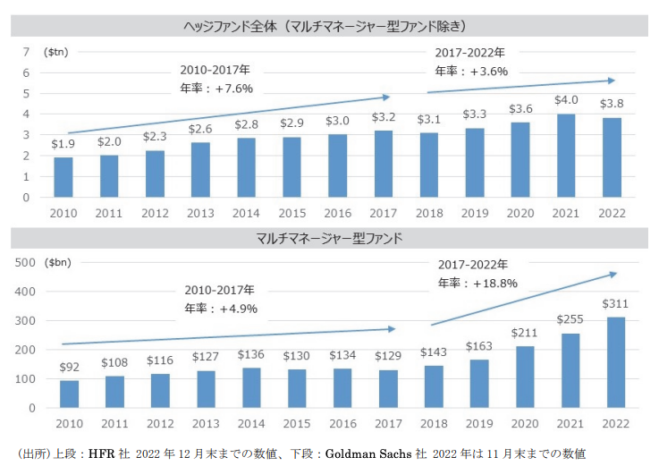 マルチマネージャー型ファンドとは、1つのファンドの資産を運用戦略・運用手法の異なる複数のマネージャーに分割して運用させる戦略のことを指します。以下の図 からも、2017年以降マルチマネージャー型ファンドの運用資産残高が急速に上昇しており、投資成果への信頼が高まり資金が集まっていることがわかります。