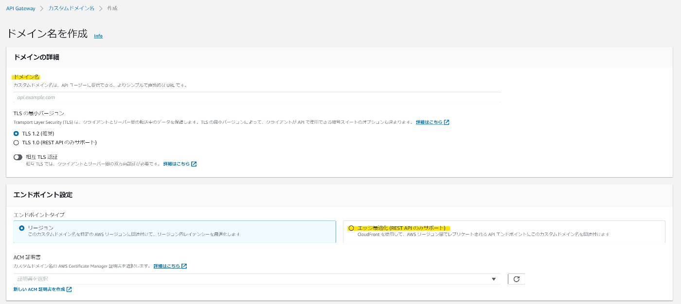 先ほど作成した ACM 証明書を指定して、ドメイン名の作成を押下します。