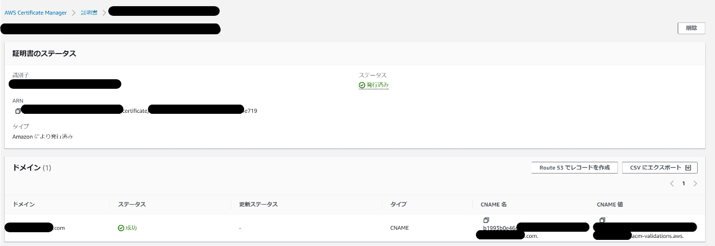 その後、名前解決をしてもらうために、Route53にCNAMEレコードを作成します。しばらく経てばステータスが発行済みになる想定です。