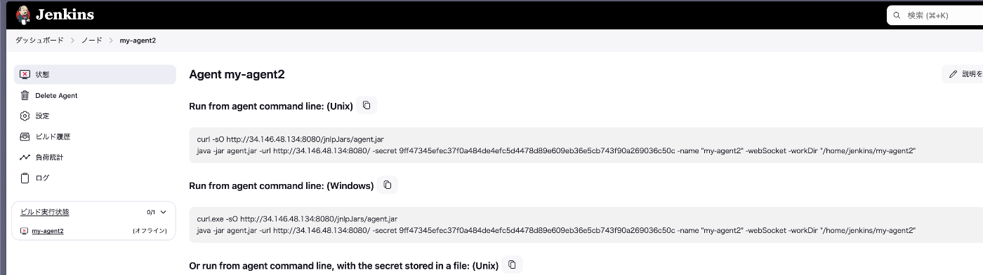 その後、各ノードのページを開くと エージェントノードで叩くべきコマンド