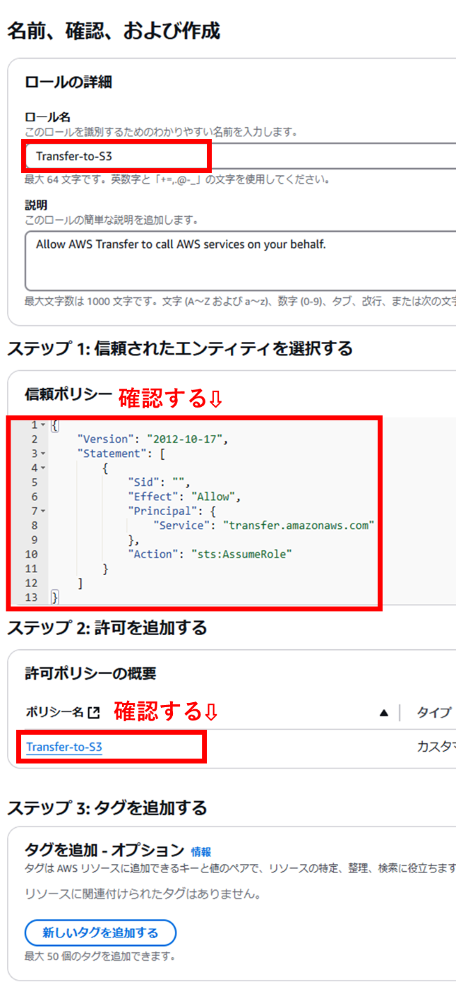 Transfer-to-S3)を入力し、信頼ポリシーとアイデンティティポリシーの内容を確認する。問題がなければ、画面右下[ロールの作成]を選択します。