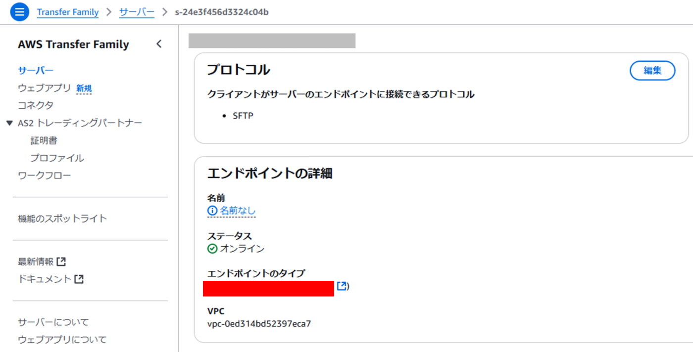- TransferFamillyの[エンドポイントのタイプ]を選択する。