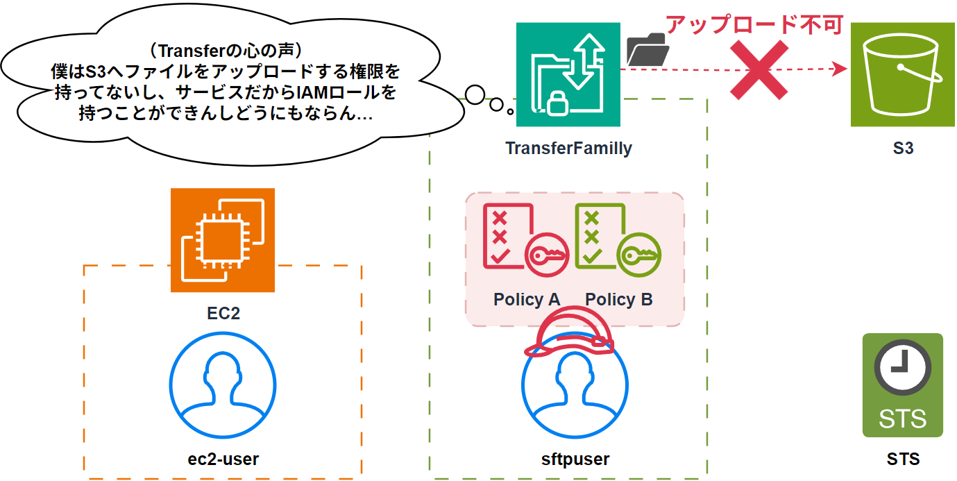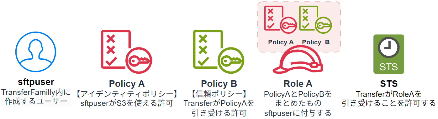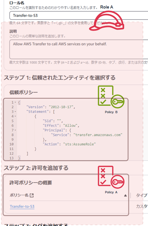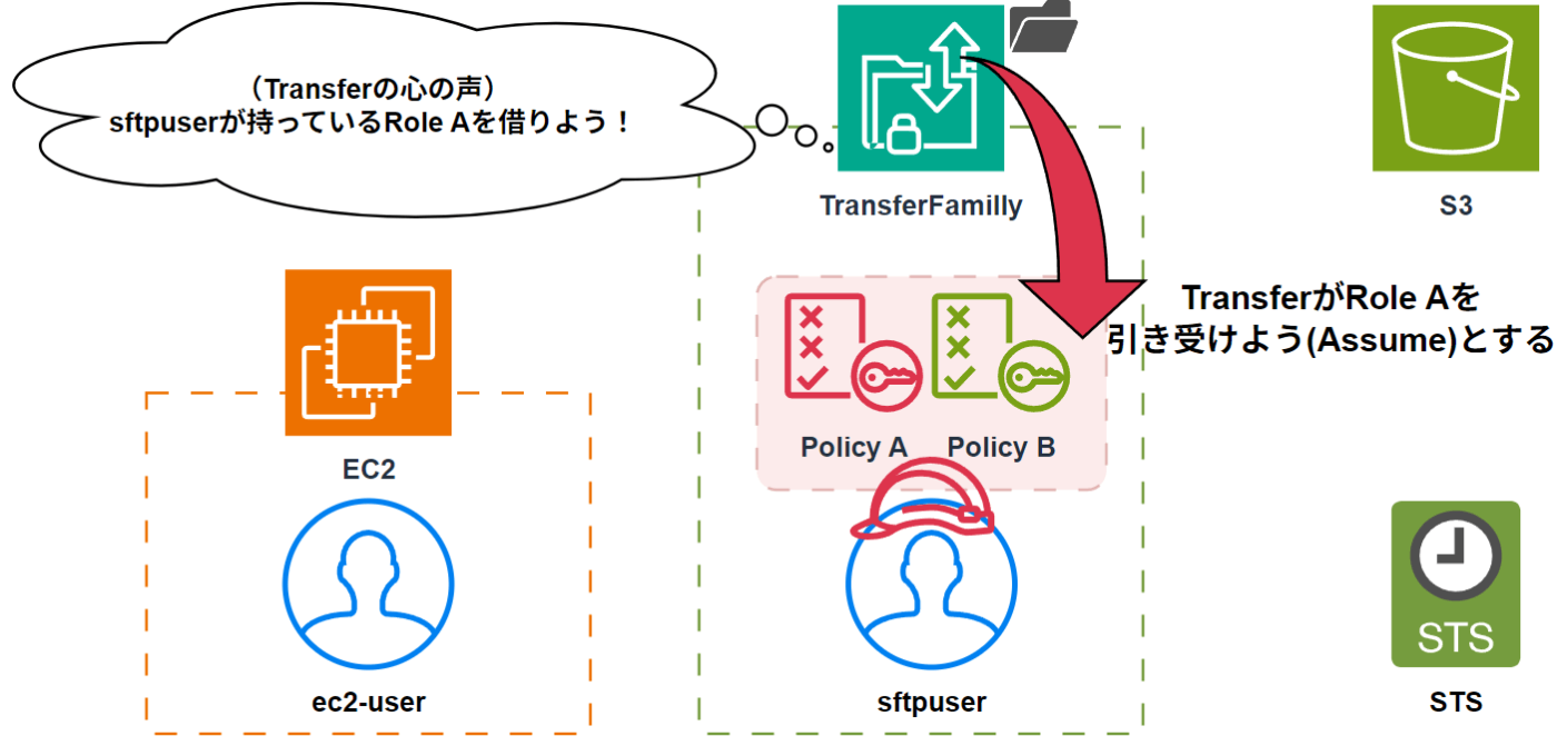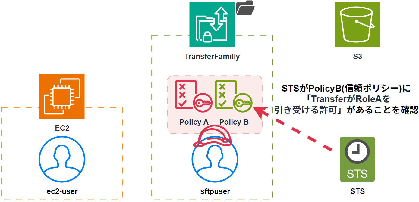 - STSがPolicyB(信頼ポリシー)に「TransferがRoleAを引き受ける許可」があるか確認する。