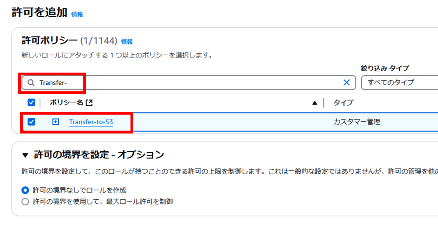 - TransferFamily内に作成するユーザーに付与するIAMロールを作成