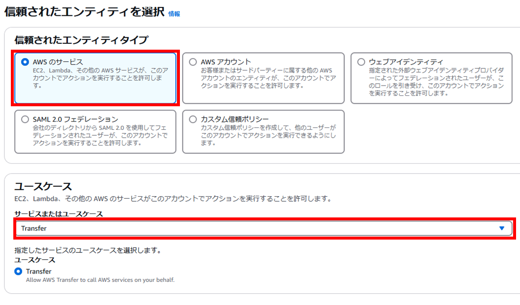 - 信頼されたエンティティタイプで[AWSのサービス]を選択し、ユースケースで[transfer]を選択する。