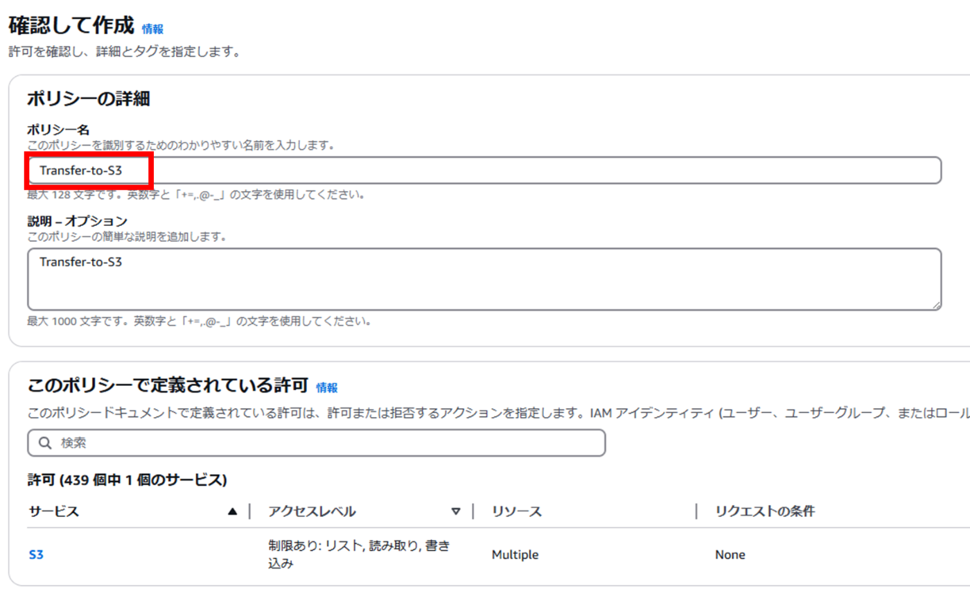 Transfer-to-S3)を入力して、画面右下[ポリシーの作成]を選択する。