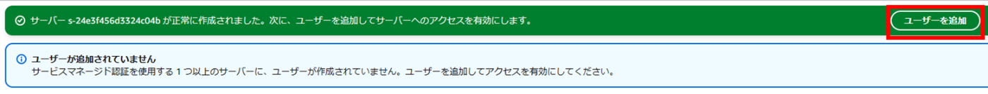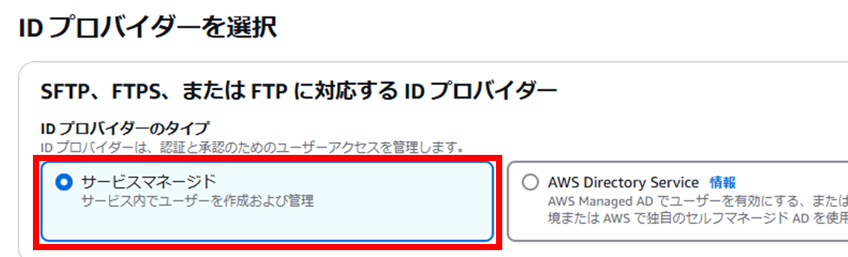 - TransferFamilly内にユーザーを新規作成するので、[サービスマネージド]を選択する。