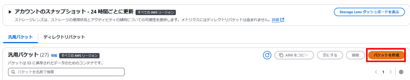 - S3コンソール内[汎用バケット]タブから[バケットを作成]を選択する。