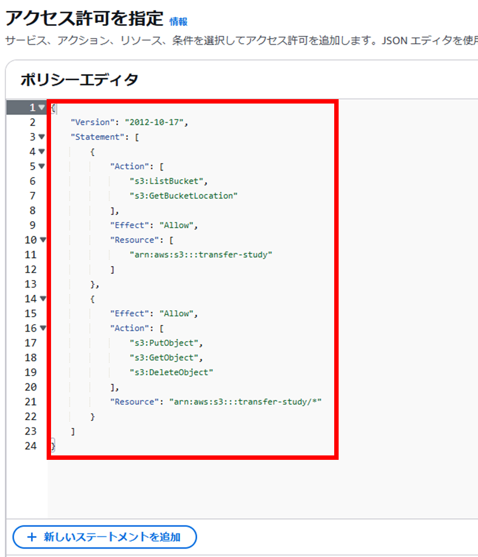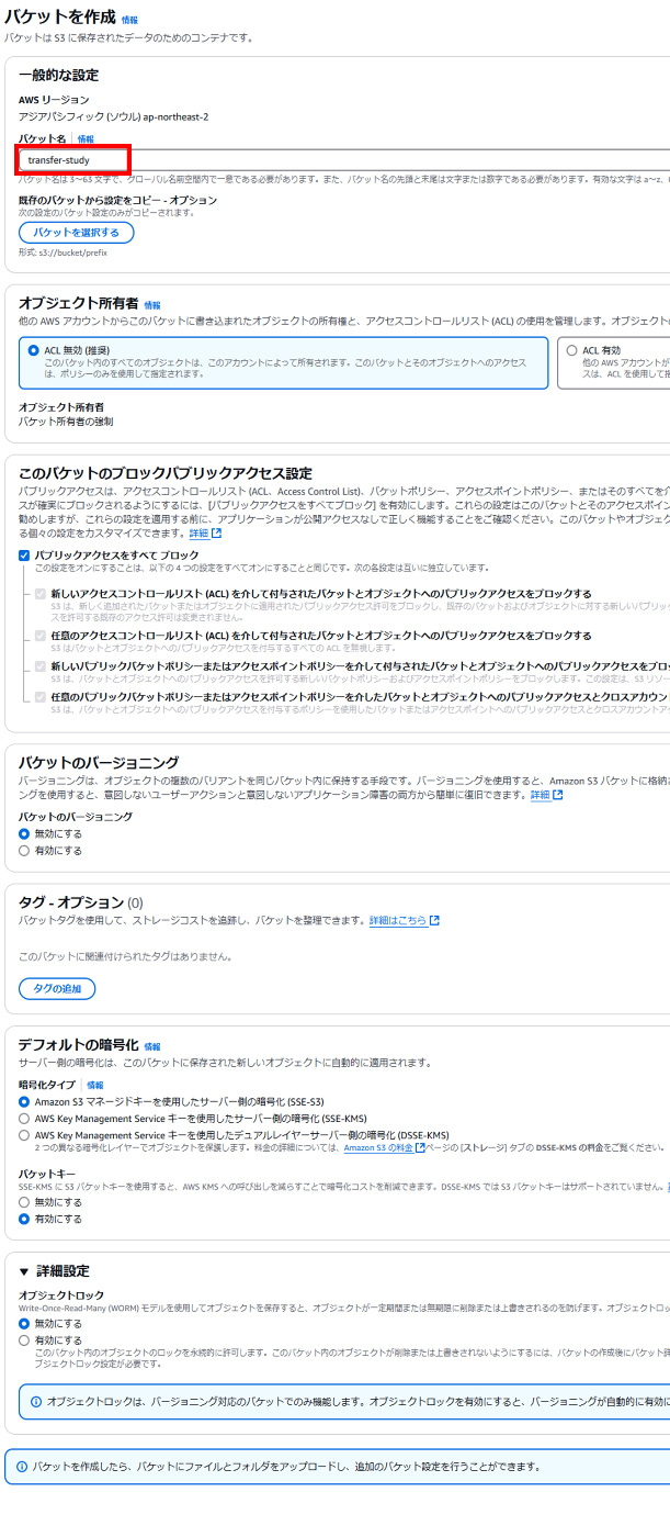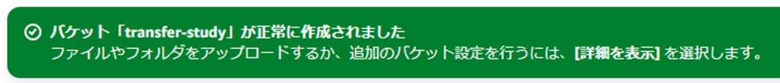 ※transfer-studyの部分には、1-2で作成したS3のバケット名が入ります。
