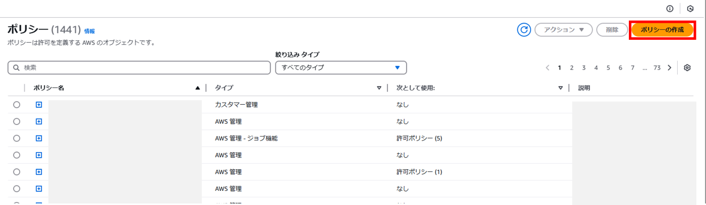 - IAMコンソール内[ポリシー]タブの[ポリシーの作成]を選択する。