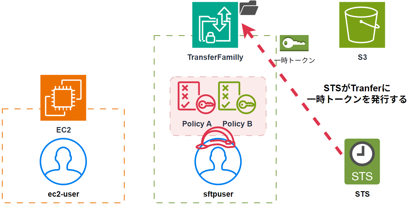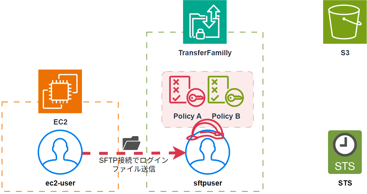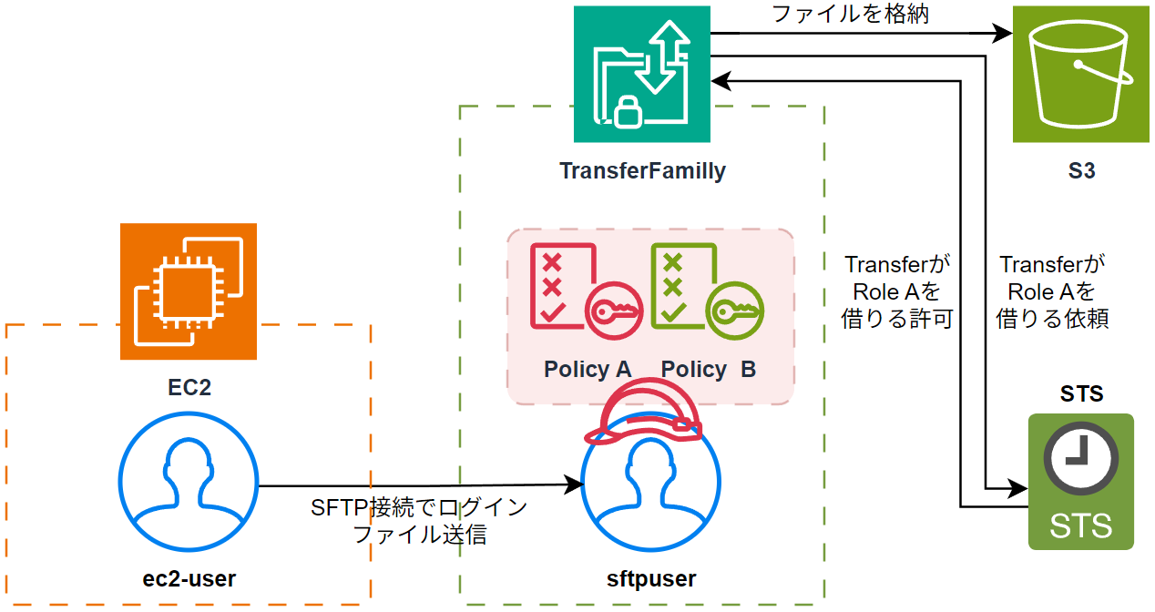 - まずec2-userがTransferFamillyにsftpuserとしてsftp接続をします。
