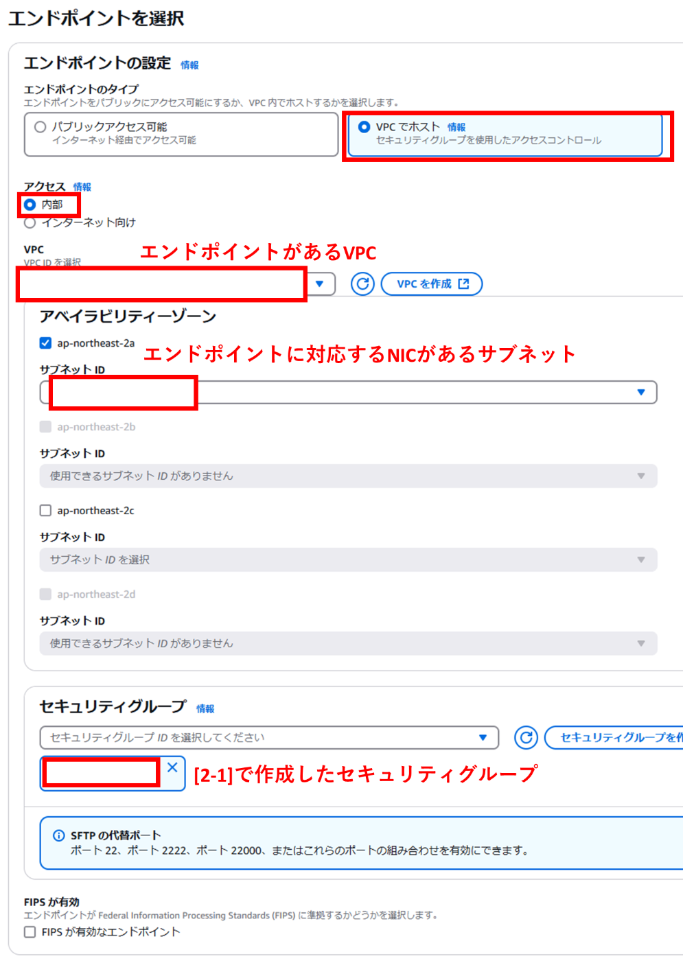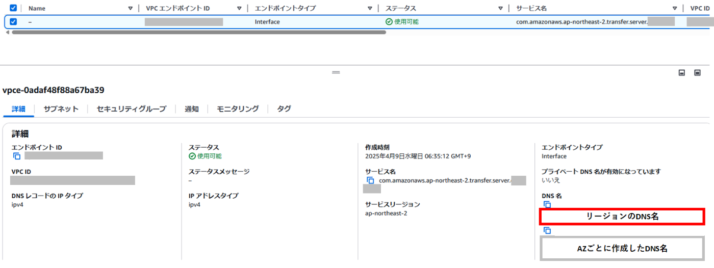 その逆に、AZ固有のDNS名を利用していてもリージョンのDNS名に切り替えることはできません。 - リンク先のように複数AZを利用してTransferFamillyをデプロイしている場合、AZのDNS名を選択すると片方のDNSエンドポイントのみしか利用できなくなってしまうから。