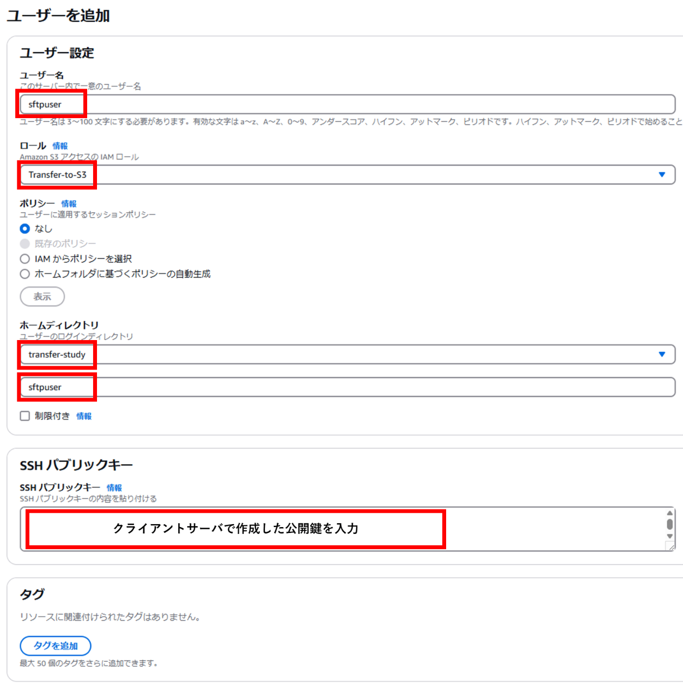 5.TransferFamily内ユーザー(=SFTP接続時にログインされるユーザー)を作成