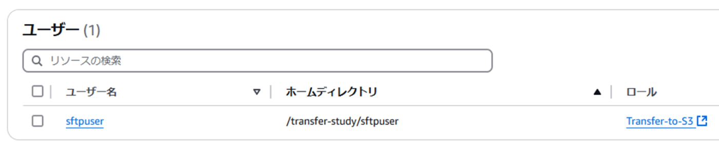 - TransferFamily内ユーザー(=SFTP接続時にログインされるユーザー)を作成