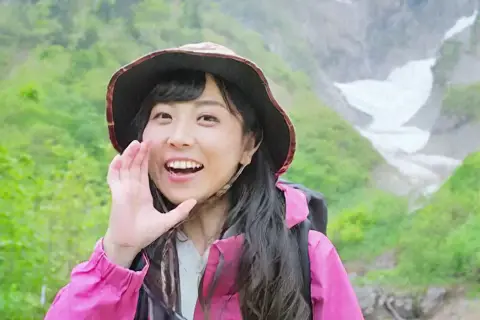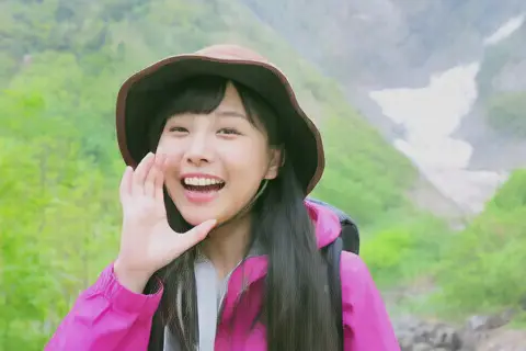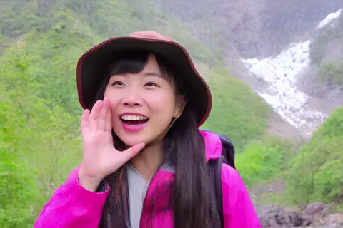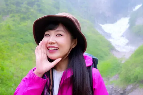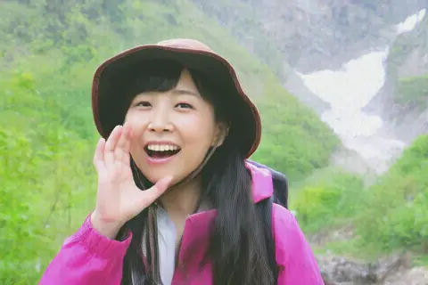 Best quality, 4k, HDR. Young Japanese woman outdoors in nature. Long black hair, bright pink raincoat (open, gray lining visible), brown bucket hat, lightweight backpack. Smiling, shouting "yoo-hoo" with left hand to mouth. Mountain slope background, valley with snow-covered stream visible. She seems at home in nature. After shouting, she waves to us.