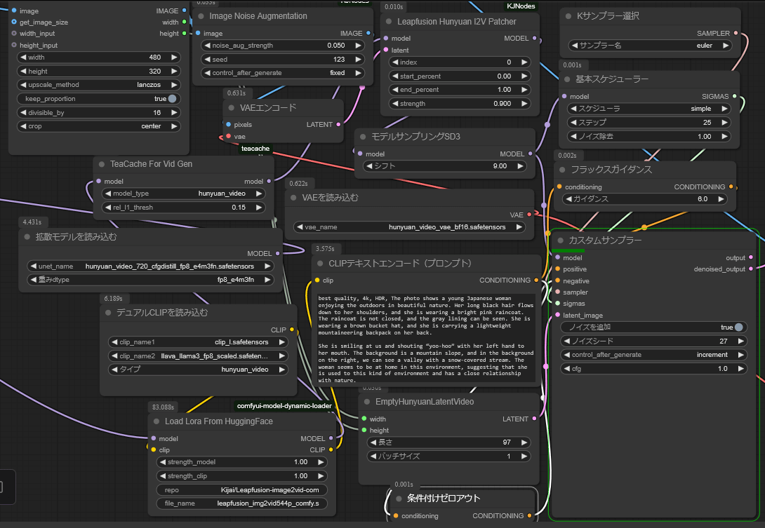 ローカル完結、低VRAM で最も良好な結果が得られる I2V は、個人的には Hunyuan-Video Skyreels だと思います。Hunyuan-Video のプロンプトに反応が良い特徴を継承しつつ、入力画像の一貫性も保持できています。