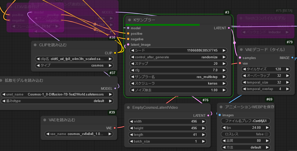 VRAM 11GB では、どう足掻いても Cosmos 動画を生成するのは厳しいです。"なにか動いているものがあることを、お判りいただけたでしょうか?"というレベルです。Workflow で提供されたVAE デコード node では、デコード時に OOM になります。VAE デコード(タイル)node で小分けにデコードします。また、プロンプトも negative prompts は空欄にして VRAM を節約します。解像度も 512×512 ではすべて OOM です。Length も 41 frames を超えると OOM になります。496×496 1.5sec 程度の動画が精一杯でした。shiba*2 さんが、A4000 16GB で解像度と生成枚数を調整する方法を紹介されていたので、11GB でもなんとか動くかもと思いましたが、甘かったです。