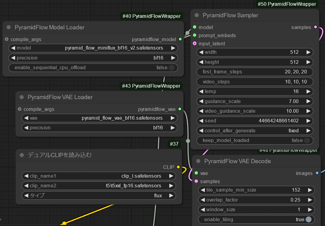 2025.01.20 現在、旧workflowで使用されていた DownloadAndLoadPyramidFlowModel node は廃止され動かなくなっています。上記、Wrapper の workflow が動きます。T2V、I2V のおよそ 3 - 5秒間の動画を作成できます。