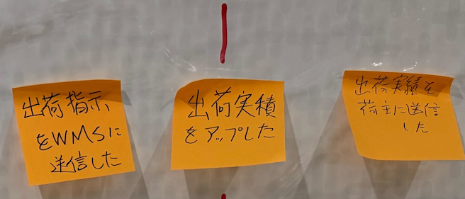 弊社の場合だと、カスタマーの出荷指示に対して、出荷実績と呼ばれる「出荷の結果」が返却されるのですが、一度出荷実績を返却すると後戻りが難しいため、ここがピボタルイベントとしてマークされました。ピボタルイベントは、そのイベントに対してホワイトボード上で縦線を引いてマークします。