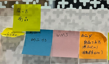 やり方としては、種類に応じて色分けされた付箋をホワイトボードにどんどん貼っていき、チーム内の理解やコンテキストを揃えていきます。今回はオンサイトでホワイトボードを使い実施していきましたが、慣れてきたら miro などのホワイトボーディングツールを使っていく方がずっと早く完了できるかと思います。