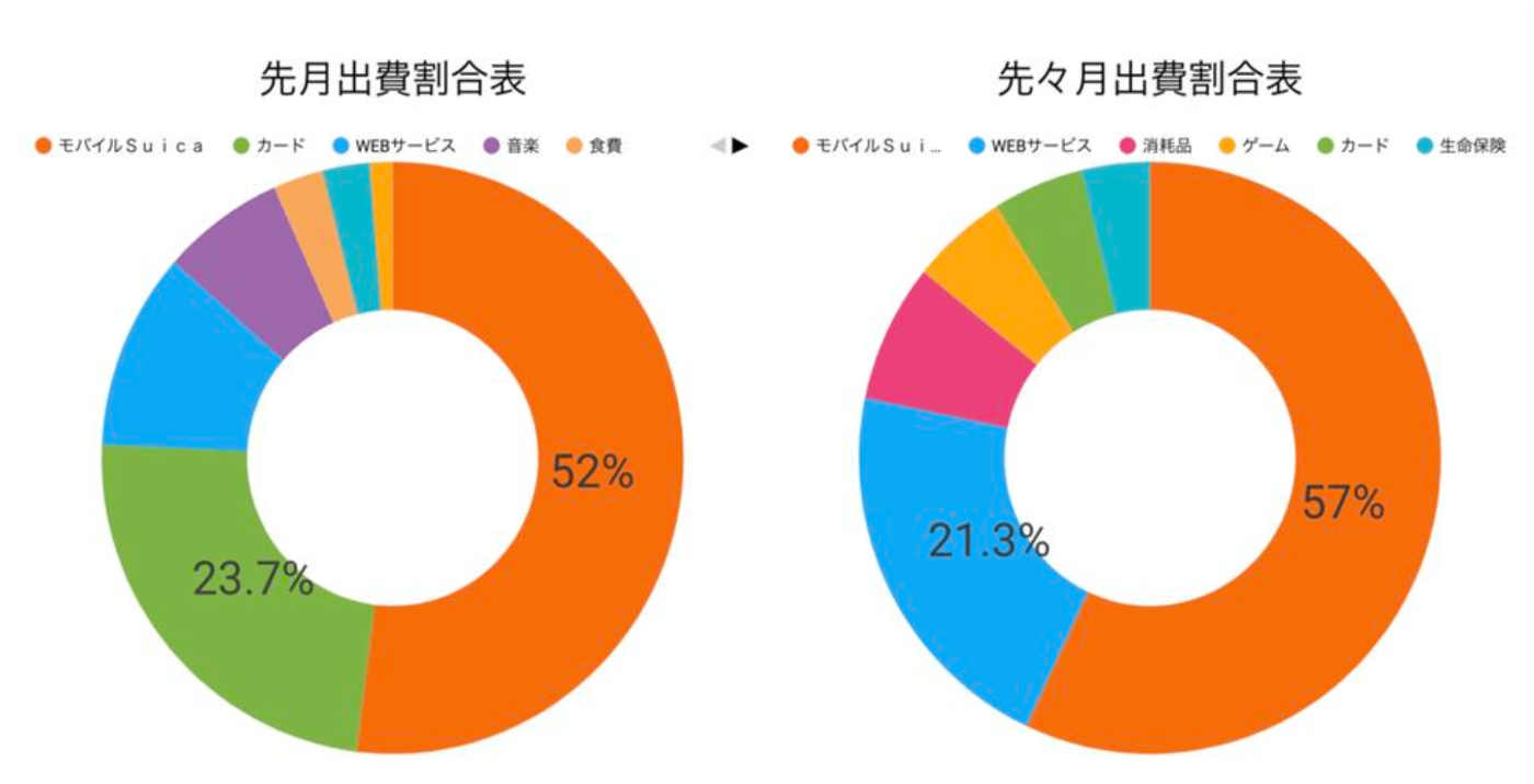 実行日前月と前々月の、カテゴリごとの出費割合比較です。ほぼモバイルSuicaやんけ!