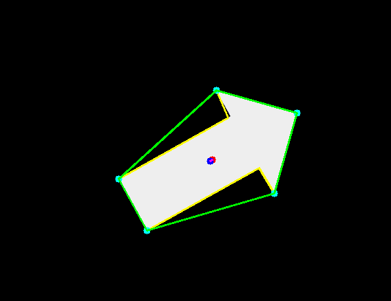 緑の線が矢印の凸包の輪郭線、青い点がその重心。