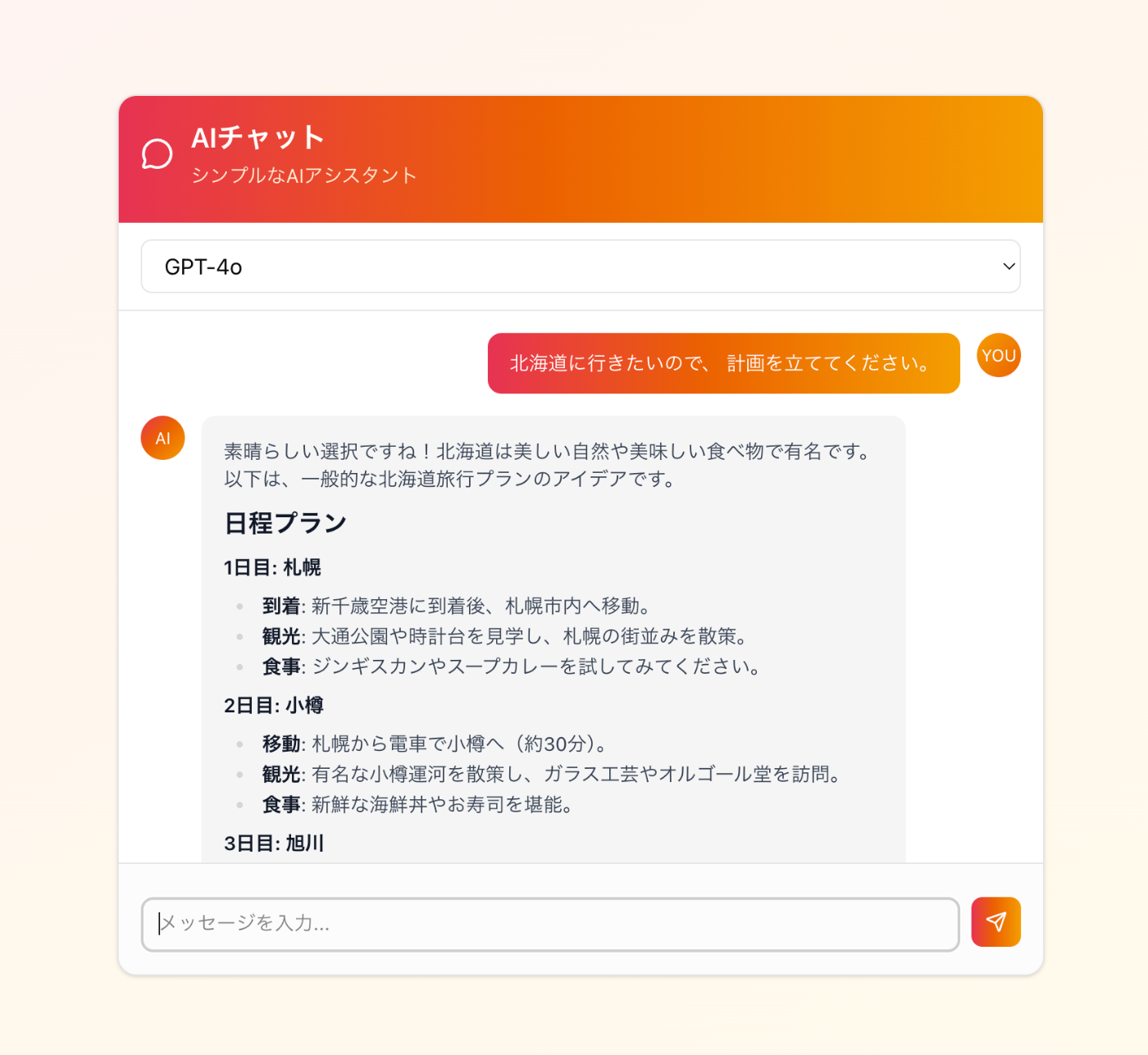 次はツール呼び出しを使ったエージェント的なアプリにも挑戦してみたいです。