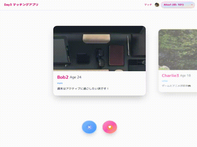 seed.ts)。 - スタイリング: マッチングアプリらしいデザインを採用。明るい色、丸みを帯びた要素、ハートやXのアイコンなどを効果的に使用し、魅力的で使いやすいUIを目指す。