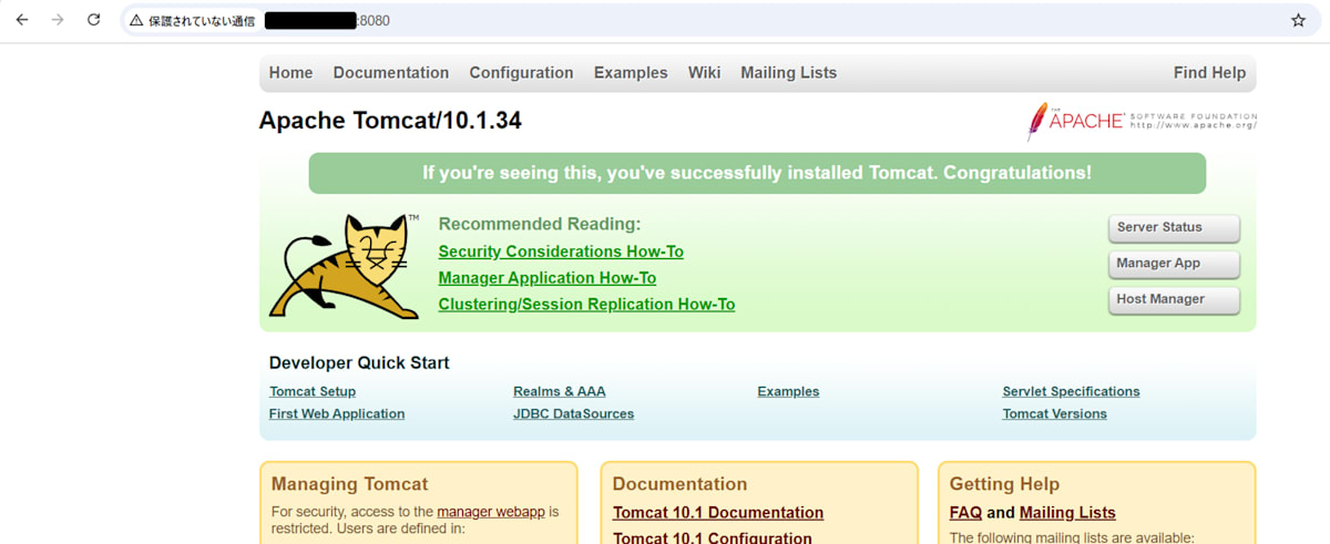 スタックファイルに記載漏れていましたが、セキュリティグループのインバウンドルールに「ポート:8080」を追加することでTomcatのデフォルトページに接続できます。