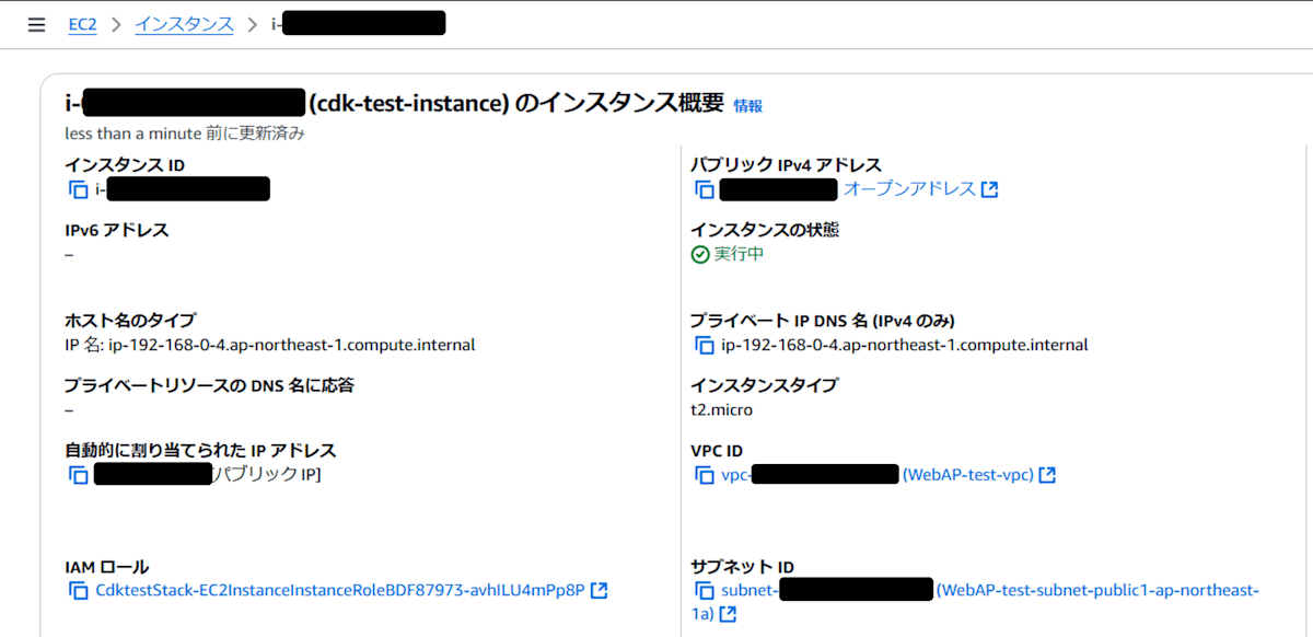 - IAMロール:CdktestStack-EC2InstanceInstanceRole(CDKにより自動作成)