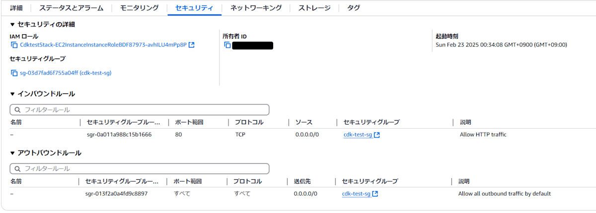 - セキュリティグループ:cdk-test-sg
