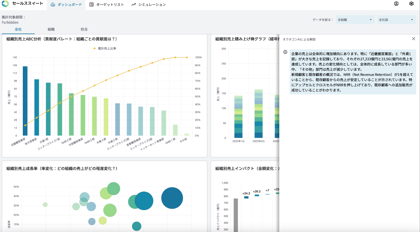 弊社のSales Suiteには、ダッシュボードとして多数のグラフがあるのですが、これを見ると多くの方は「?」となってしまうと思います。我々はそのようなユーザ課題に対し、LLMを使ってこのグラフの設計意図や、グラフからわかることを要約・解説する機能を実装しています。このような機能も、実際にプロダクトを作り、リリースする中で見えたユーザ課題から、試作・評価・実装・リリースしたものです。