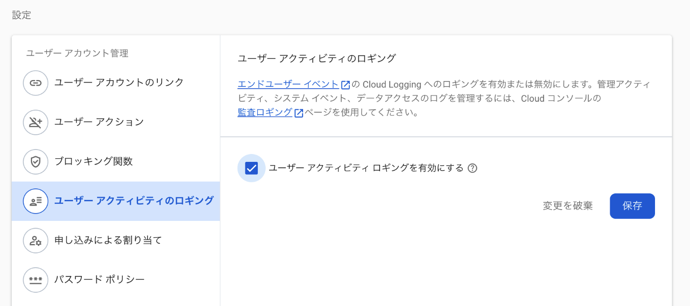 アップグレードを完了すると、Firebaseコンソール上でロギングなどの機能が利用可能になっています。ユーザーアクティビティ ロギングを有効にするにして「保存」をクリックします。