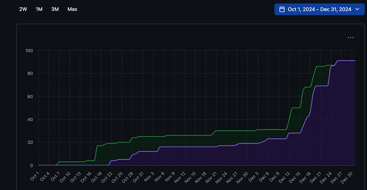 このプロジェクトと同時に別のプロジェクトが進行しており、新規開発を行なっていたため、減らしたと思ったらまた増えてしまう、時間が取れない、などの問題がありました。12月中旬に一気に角度がついてるのは、片方が落ち着きこのプロジェクトに集中できたからです。