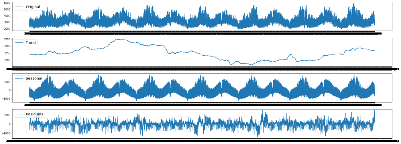 24時間×365日=8760を周期として季節調整を行いましたが、残差が原系列に対していささか割合として大きい様に思います。これは、データが細かすぎると、乗っているノイズも含めて最適化をおこなうために、トレンド成分と季節成分で表すことができない値が大きくなってしまうためだと思われます。