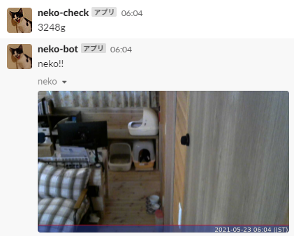 ネコがトイレに入ったら、体重と写真がSlackに通知されるという仕組みで運用しています。