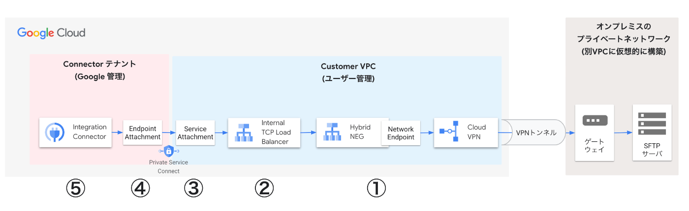 Application Integration / Integration Connector は Google Cloud 上で動作するサービスのため、前提としてGoogle Cloud の VPC とオンプレミスなどのプライベートネットワークとの接続が確立していることが前提となります。
