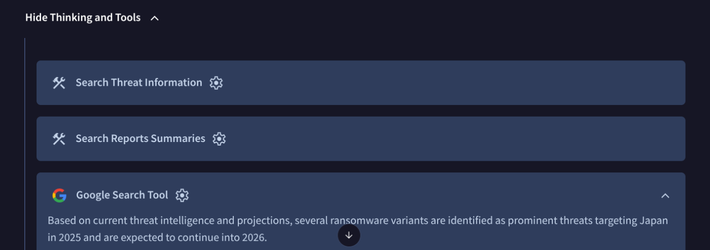 - ツールの自律実行: 立案された計画に基づき、VirusTotal のデータや Mandiant のレポートなど、最適なリソースを適宜選択し、直接アクセスして情報を取得します。