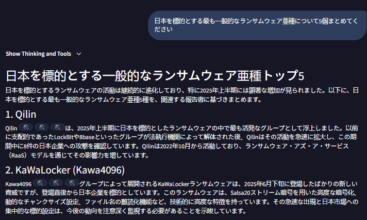 数分後、攻撃アクターの特定、MITRE ATT&CK へのマッピング、および推奨される対応策などがユーザーの指示に応じて整理された形で出力されます。