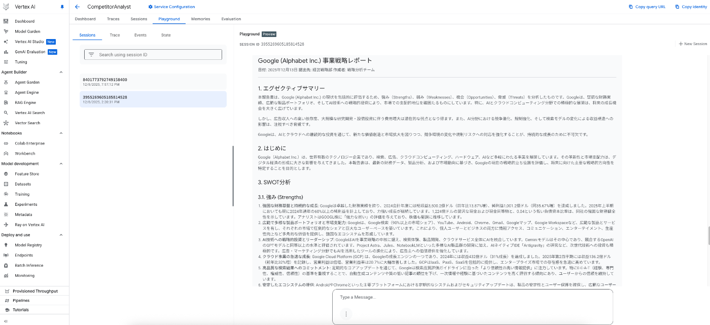 しばらくすると、マルチエージェントにより生成された最終レポートが返されます。