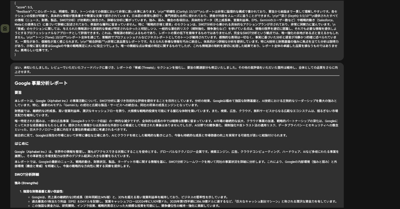 - Loop Agent が品質チェックを行い、評価基準に満たされたレポートが出来上がるまで改善していきます。(下記画像は記事作成↔️評価フローの一部です)